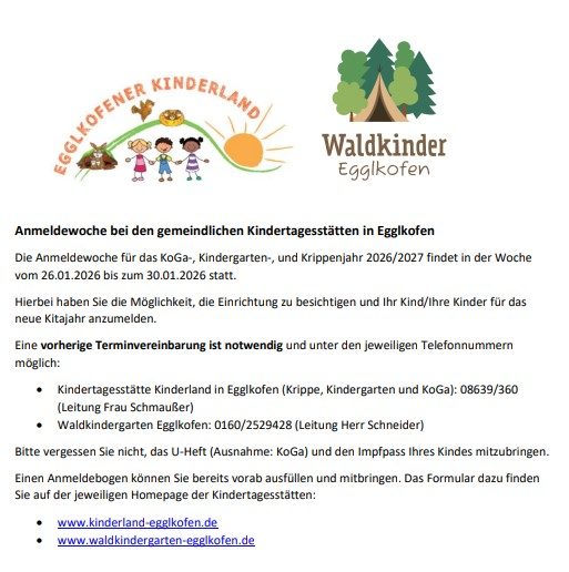 In der Woche vom 27.01 – 31.01.2025 findet im Waldkindergarten Egglkofen (Harpoldener Str. 6; 84546 Egglkofen) die Anmeldung für das kommende Kindergartenjahr 2025/26 statt.